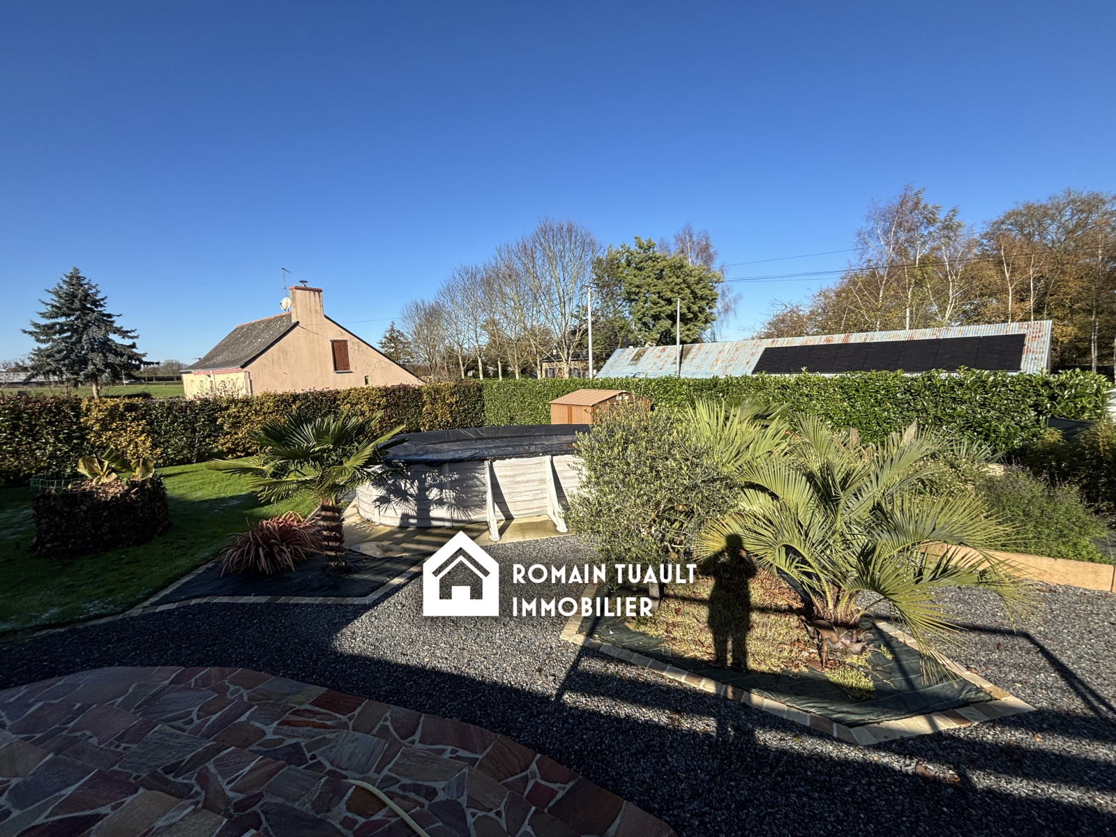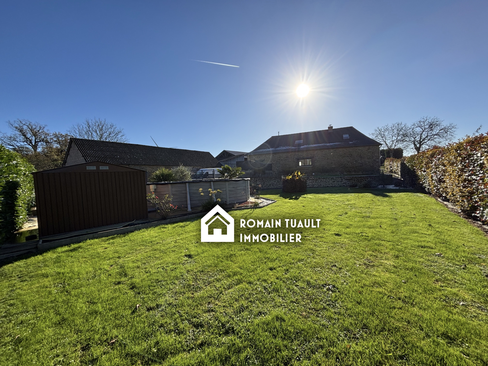 Une terrasse de 63 m2, une piscine hors-sol (7x3) et un abri de jardin.
